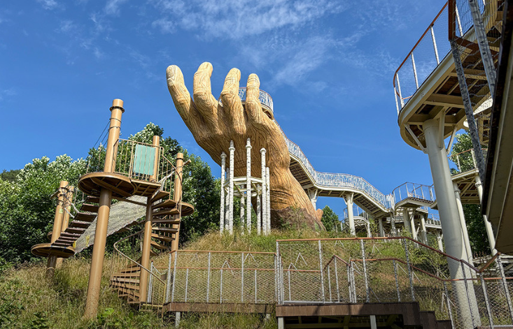 트리탑은 총길이 133m, 평균 높이 10m로 숲속 나무 사이를 걷는 듯한 기분을 느낄 수 있는 산책로입니다. 트리탑 끝에는 ‘손전망대’가 자리하고 있는데, 이곳은 높이 18m의 독특한 구조로 만들어져 ‘하늘을 향해 뻗은 손’을 형상화했습니다. 오른손 모양의 구조물은 ‘바른손(Right Hand)’이라 불리며, 백두대간의 정기를 담는 상징적인 의미를 지니고 있습니다.