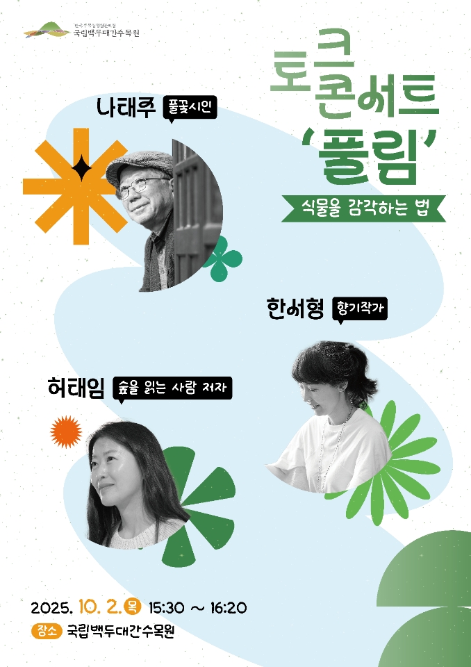 축제의 하이라이트는 나태주 시인과 함께하는 토크콘서트 ‘풀림’입니다. 시와 숲, 향기를 주제로 한 감성적인 대화가 준비되어 있으며, 인문학적 울림을 선사합니다. 또한 지역 예술인들의 버스킹 공연, 숲속 프리마켓, 농특산물 체험까지 가족과 함께 즐길 수 있는 다채로운 프로그램이 펼쳐집니다.